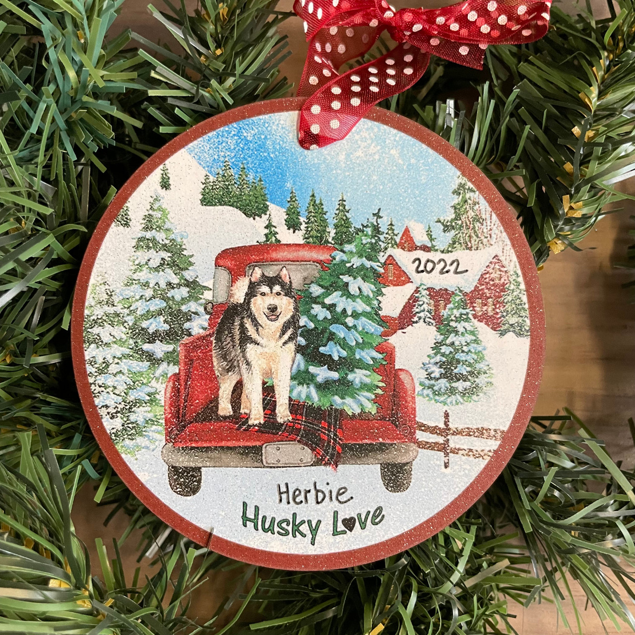Click the button below to add the Husky Red Truck Personalized Christmas Ornament to your wish list.