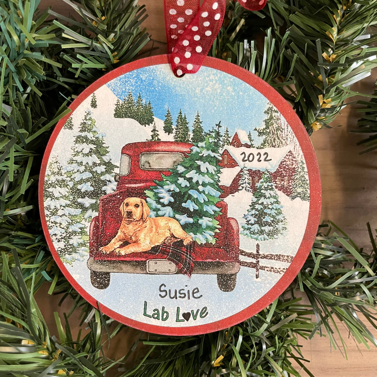 Click the button below to add the Yellow Lab Red Truck Personalized Christmas Ornament to your wish list.
