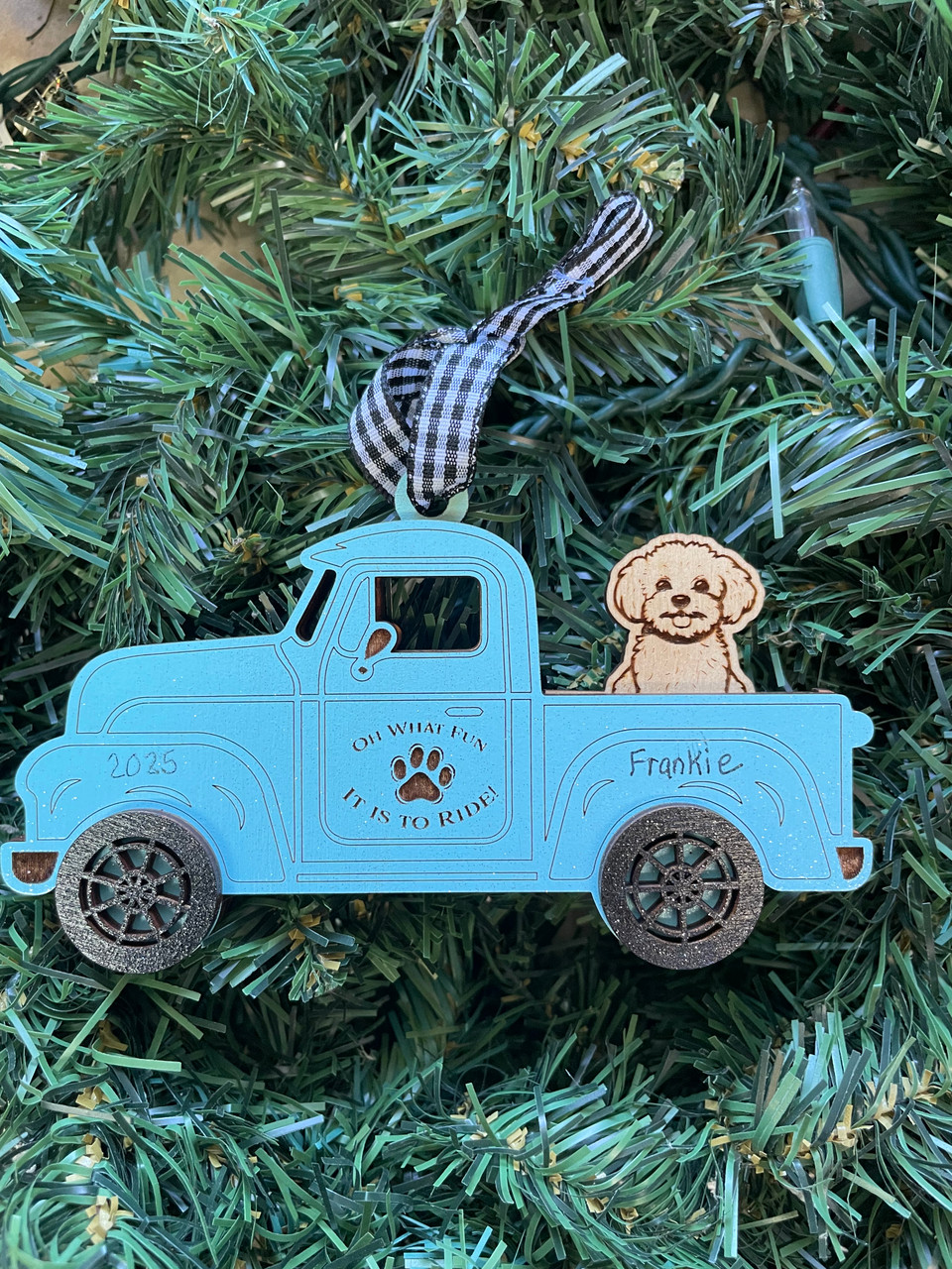 This is a multi layered truck ornament measuring 3" tall x 5" wide. We can personalize the truck with the dogs name and add a year! Perfect for all the dog lovers!!