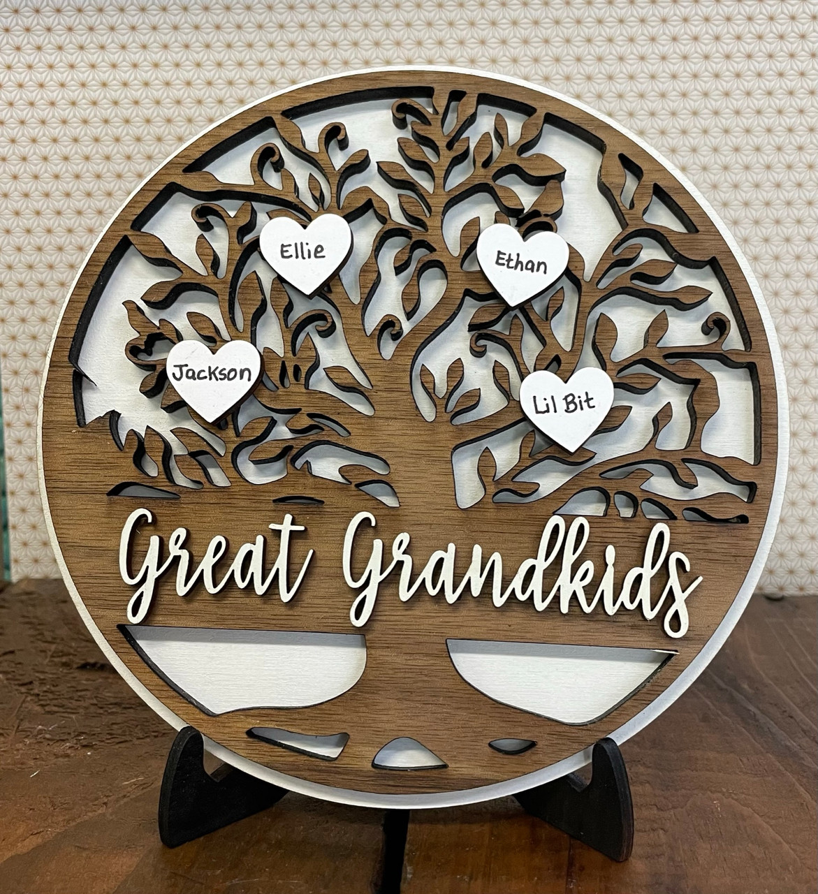 Loading... Please wait...This beautiful Walnut Great Grandkids tree measures 6”. The tree comes with hearts which can be personalized! Also included is a small easel for it to stand on. Additional options are a heart with angel wings or a heart with paw prints, sold separately.
