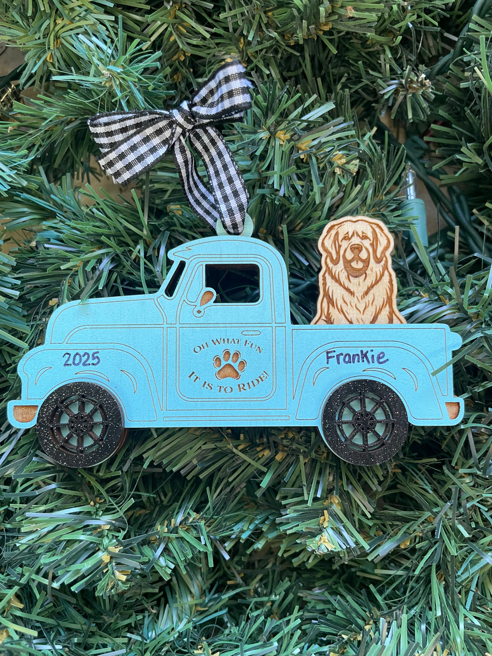 This is a multi layered truck ornament measuring 3" tall x 5" wide. We can personalize the truck with the dogs name and add a year! Perfect for all the dog lovers!!