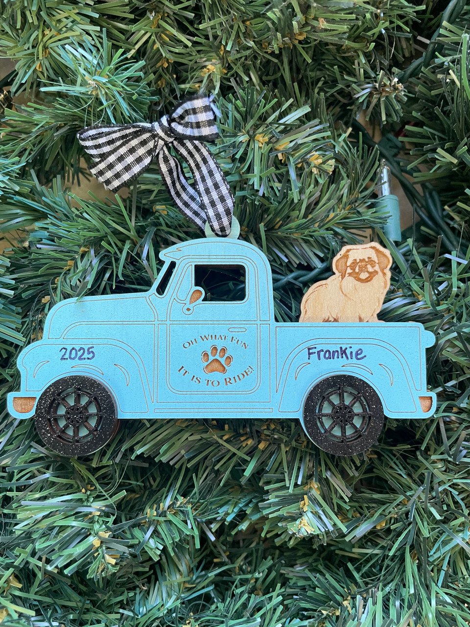 This is a multi layered truck ornament measuring 3" tall x 5" wide. We can personalize the truck with the dogs name and add a year! Perfect for all the dog lovers!!