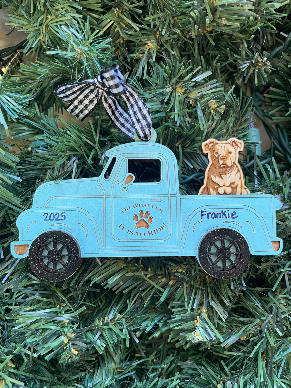 This is a multi layered truck ornament measuring 3" tall x 5" wide. We can personalize the truck with the dogs name and add a year! Perfect for all the dog lovers!!