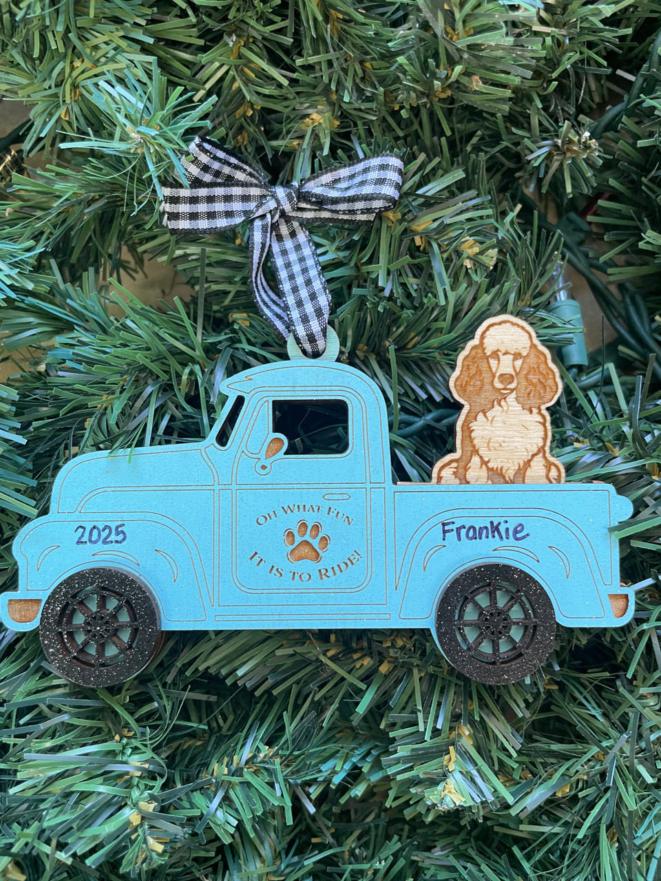 This is a multi layered truck ornament measuring 3" tall x 5" wide. We can personalize the truck with the dogs name and add a year! Perfect for all the dog lovers!!