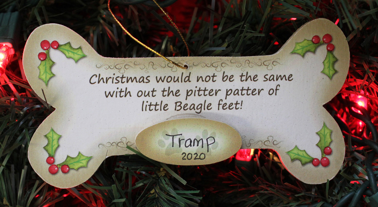 Loading... Please wait...Christmas would not be the same with out the pitter patter of little Beagle feet! Cute and ready to be personalized with your dog's name. We can even add the year if you would like. The ornament is made of wood and measures 4 1/2 inches wide by 2 inches tall.
