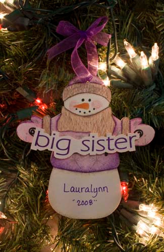 Loading... Please wait...Big Sister Snowman Personalized Christmas Ornament. This ornament is made of 1/8" wood and hangs by a ribbon. The ornament measures 5" tall by 4 1/2" wide. We will personalize with a name and the year if you would like. This ornament comes in purple only.