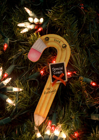 Pencil Candy Cane Ornament made of 1/8" wood, measuring 6" tall x 2 1/2" wide. The ornament hangs by wire and has a small chalk board which says Coach. Can be personalized with the Coach's Name and the year!