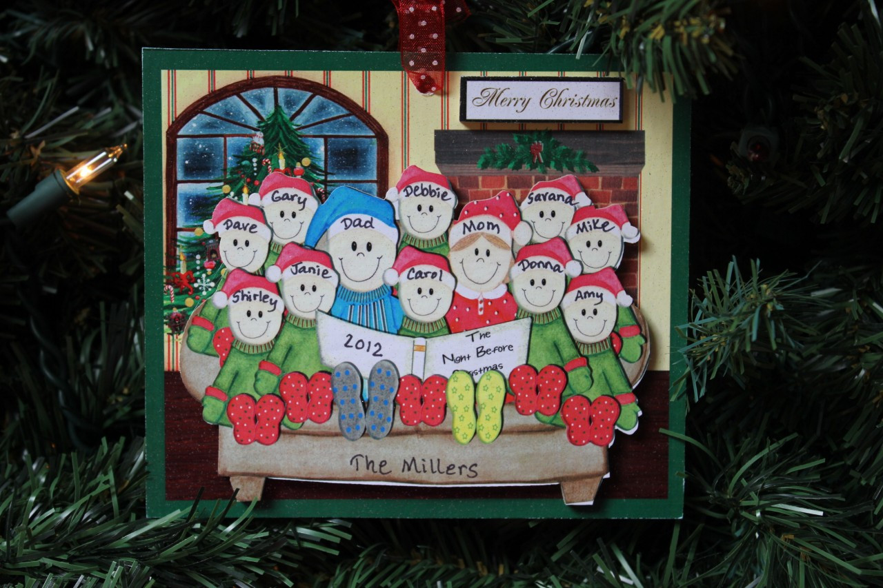Loading... Please wait...This elf couple and 10 children are snuggled on the couch reading The Night Before Christmas. This ornament is made of 1/8 inch wood and measures 5 3/8" across and 4 5/8" up and down, it hangs with a red/white polka dot ribbon.