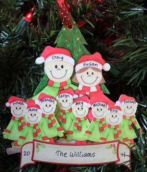 Loading... Please wait...This Elf Ornament includes 2 large elves and 8 small ones, each can be personalized on their hat. The banner can be personalized also to your specifications. We have added the date on the ends of the banner in our sample, please specify that also. The ornament is made of 1/8 inch wood and measures 6" x 6".