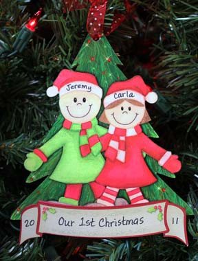Loading... Please wait...This Elf Ornament includes 2 large elves, each can be personalized on their hat. The banner can be personalized also to your specifications. We have added the date on the ends of the banner in our sample, please specify that also. The ornament is made of 1/8 inch wood and measures 6" x 6".