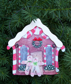 Loading... Please wait...Gingerbread man family personalized Christmas ornament for 2. This wooden Christmas ornament is made out of 1/8" plywood and hangs from a wire. We will personalize the gingerbread men and can add a date in the wreath. This personalized Christmas ornament measures 4 1/4 inches by 4 3/4 inches.