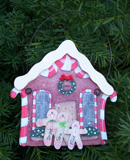 Loading... Please wait...Gingerbread man family personalized Christmas ornament for 3. This wooden Christmas ornament is made out of 1/8" plywood and hangs from a wire. We will personalize the gingerbread men and can add a date in the wreath. This personalized Christmas ornament measures 4 1/4 inches by 4 3/4 inches.