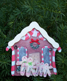 Loading... Please wait...Gingerbread man family personalized Christmas ornament for 5. This wooden Christmas ornament is made out of 1/8" plywood and hangs from a wire. We will personalize the gingerbread men and can add a date in the wreath. This personalized Christmas ornament measures 4 1/4 inches by 4 3/4 inches.
