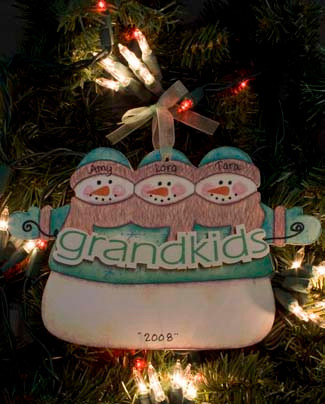 Loading... Please wait...Grandkids 3 Ornament. This measures 6" wide by 5" tall and is made of 1/8 inch plywood. We personalize the hats on each of the snowmen. If you would like it dated with the year, please specify in the personalization information below.