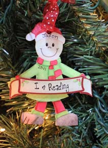 I Love Reading Elf green, is made of 1/8 plywood and measures d 3 3/4" tall by 3" wide. We will personalize it with the name and the year as per your instructions!!