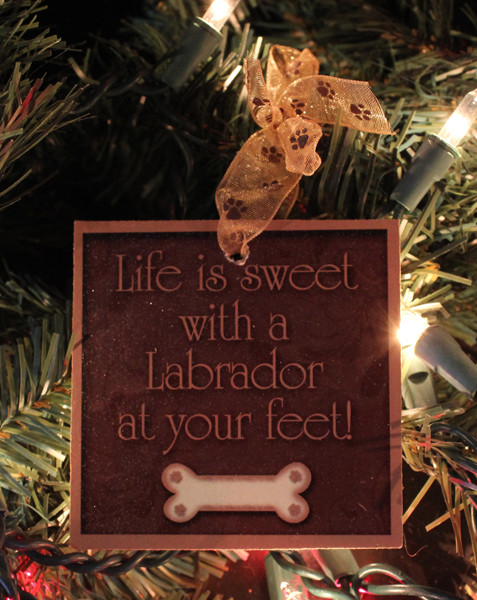 Loading... Please wait...Life is sweet with a Labrador at your feet Christmas ornament. This adorable ornament is personalized free with your pets name. This ornament is aproxamitly 3.25 inches wide by 3.25 inches tall. The ornament makes the perfect addition to any Christmas tree.