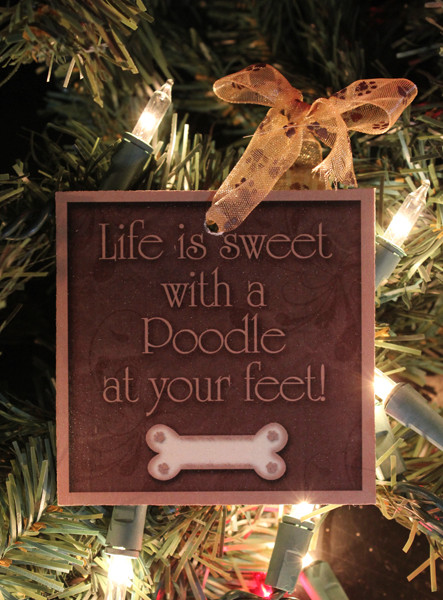 Loading... Please wait...Life is sweet with a Poodle at your feet Christmas ornament. This adorable ornament is personalized free with your pets name. This ornament is aproxamitly 3.25 inches wide by 3.25 inches tall. The ornament makes the perfect addition to any Christmas tree.