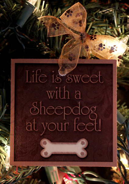Loading... Please wait...Life is sweet with a Sheepdog at your feet Christmas ornament. This adorable ornament is personalized free with your pets name. This ornament is aproxamitly 3.25 inches wide by 3.25 inches tall. The ornament makes the perfect addition to any Christmas tree.