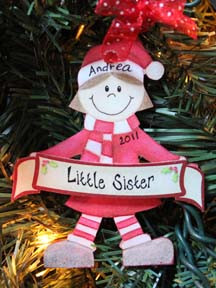 Little Sister Elf red, is made of 1/8 plywood and measures d 3 3/4" tall by 3" wide. We will personalize it with the name and the year as per your instructions!!