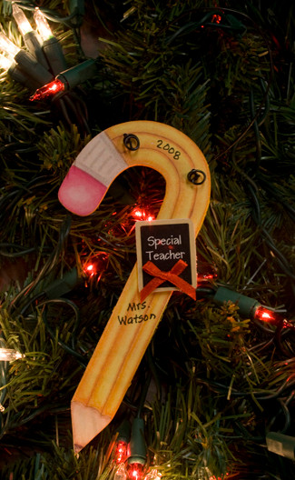 Pencil Candy Cane Ornament made of 1/8" wood, measuring 6" tall x 2 1/2" wide. The ornament hangs by wire and has a small chalk board which says Special Teacher. Can be personalized with the Teacher's Name and the year!