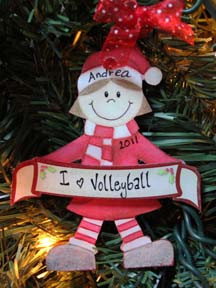 Volleyball Elf red, is made of 1/8 plywood and measures d 3 3/4" tall by 3" wide. We will personalize it with the name and the year as per your instructions!!
