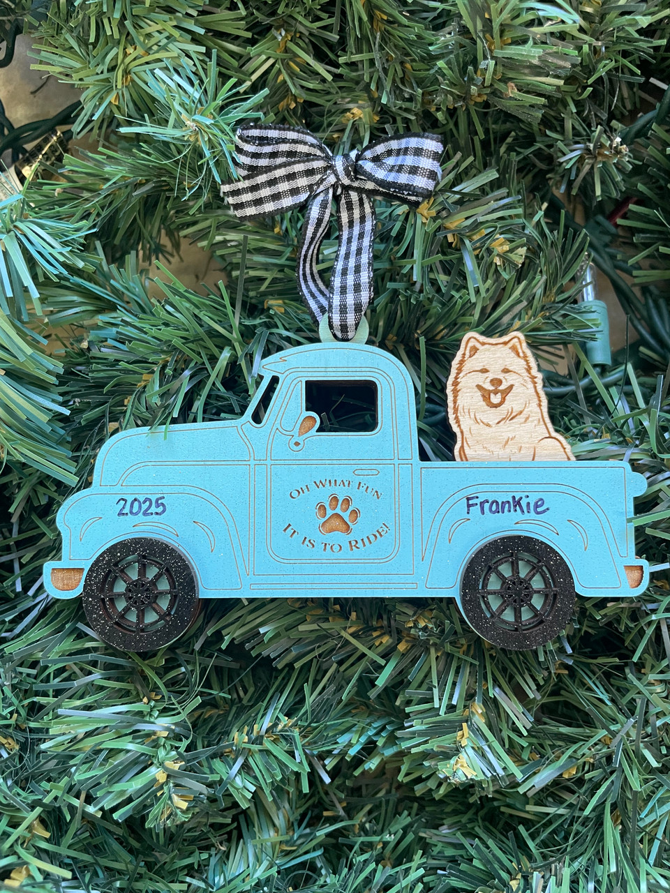 This is a multi layered truck ornament measuring 3" tall x 5" wide. We can personalize the truck with the dogs name and add a year! Perfect for all the dog lovers!!