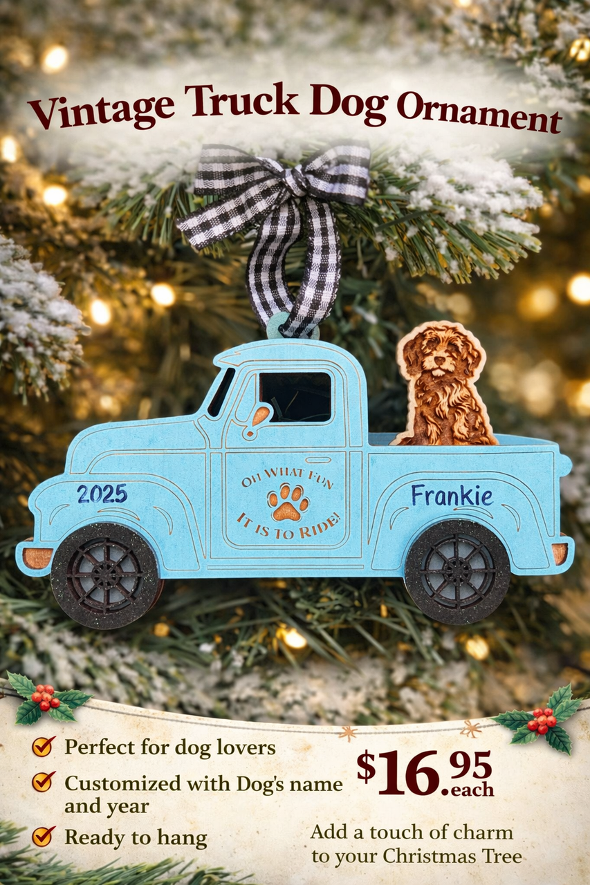 This is a multi layered truck ornament measuring 3" tall x 5" wide. We can personalize the truck with the dogs name and add a year! Perfect for all the dog lovers!!