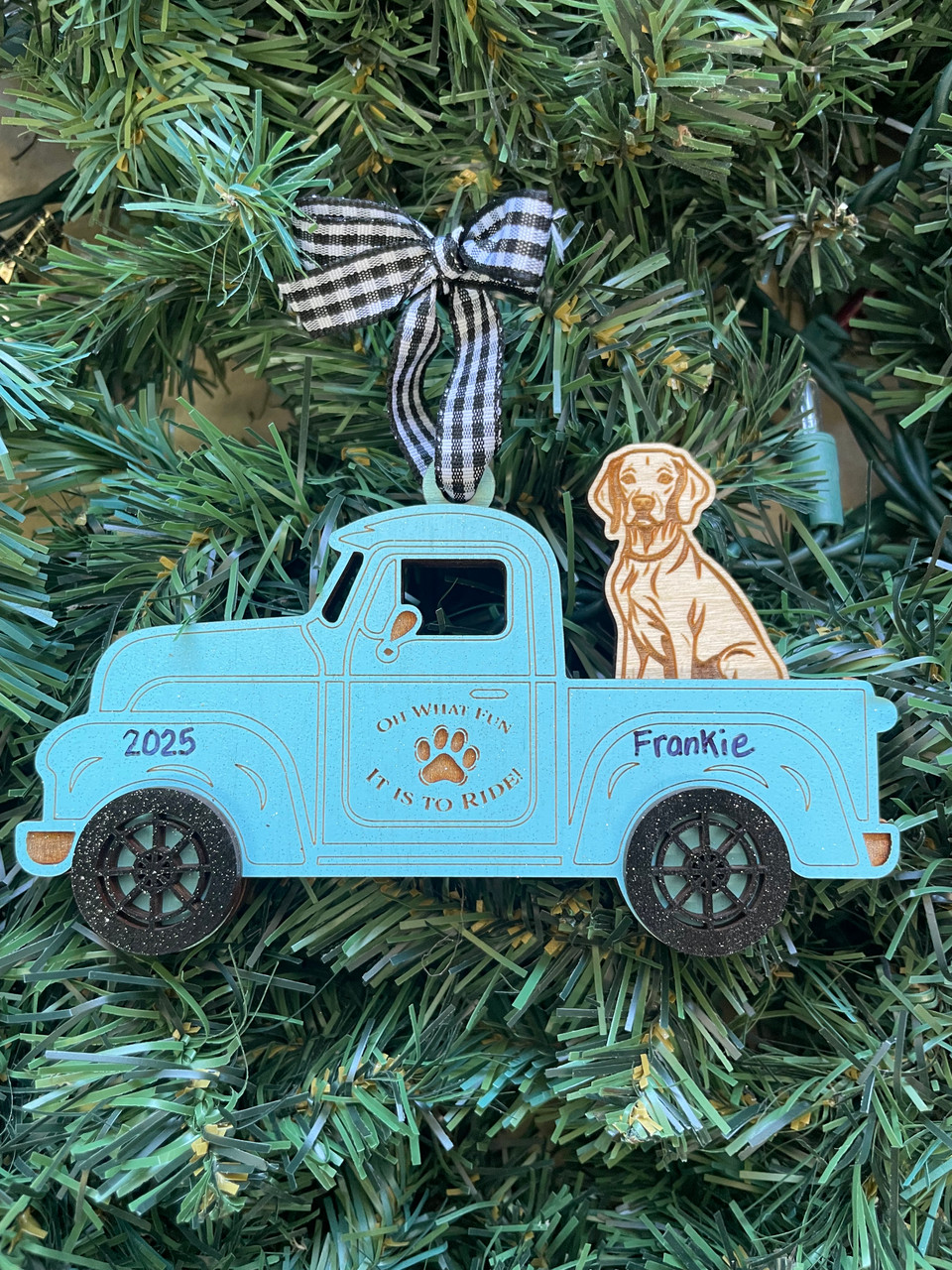This is a multi layered truck ornament measuring 3" tall x 5" wide. We can personalize the truck with the dogs name and add a year! Perfect for all the dog lovers!!